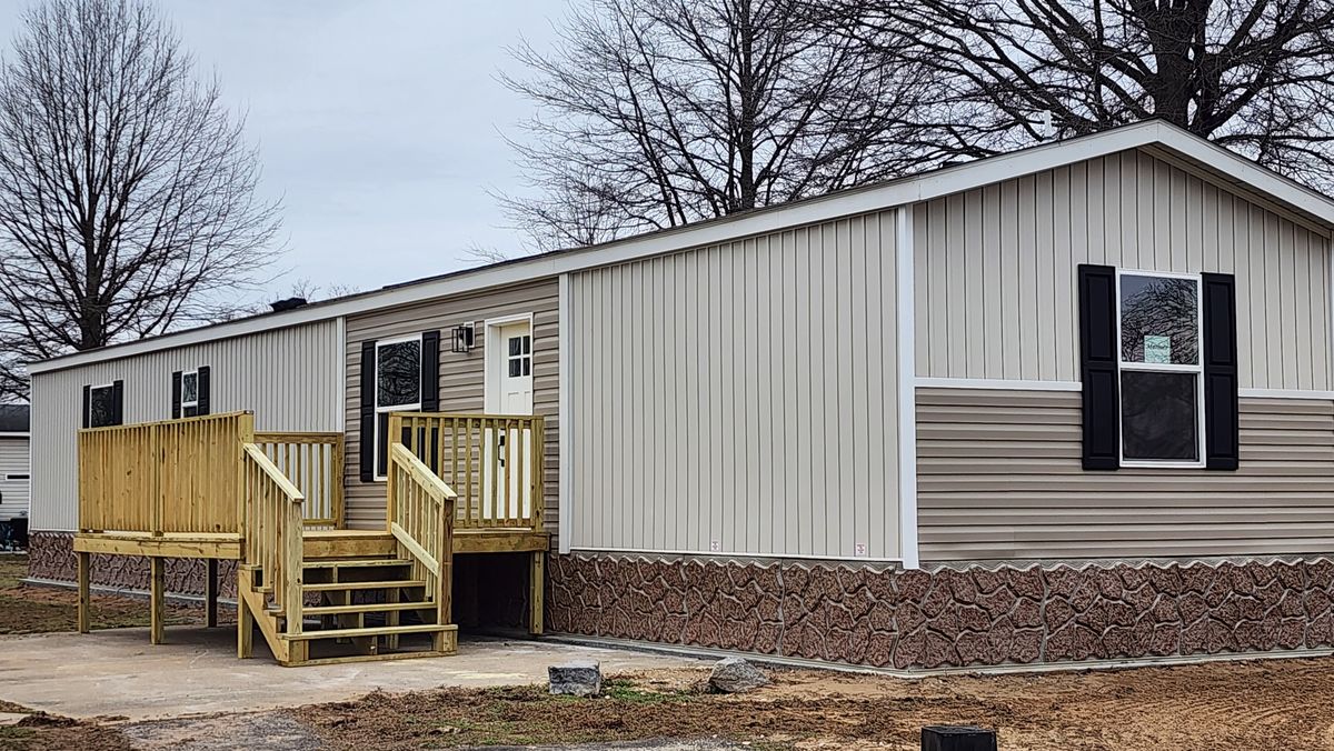 Setup with rock style skirting, water, sewer, electric hooked up, and HVAC installed!